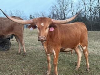 Out of a FIFTY-FIFTY BCB daughter and award-winning bull, CATCH, this lady not only has a stellar pedigree but has put on almost 35" of horn in a little over a year! She measures 50" TTT at 21 months and her horns are hooking! She is as sweet as they come, very tall and full bodied, and has great conformation. Her outstanding pedigree includes Expedite, Cowboy Chex, Drag Iron, BL Rio Catchit, a line of Horseshoe J cows, J.P Rio Grande, J.R Grand Slam, Peacemaker 44, Ringa Dinger, Gunman, Watson 83 and Emperor to name a few. This heifer is truly the complete package and her love of being hand fed and scratched is the icing on the cake. She will easily be your favorite and her future offspring will take your program to the next level. You definitely don't want to miss out on this amazing girl as she just keeps getting better and better!!